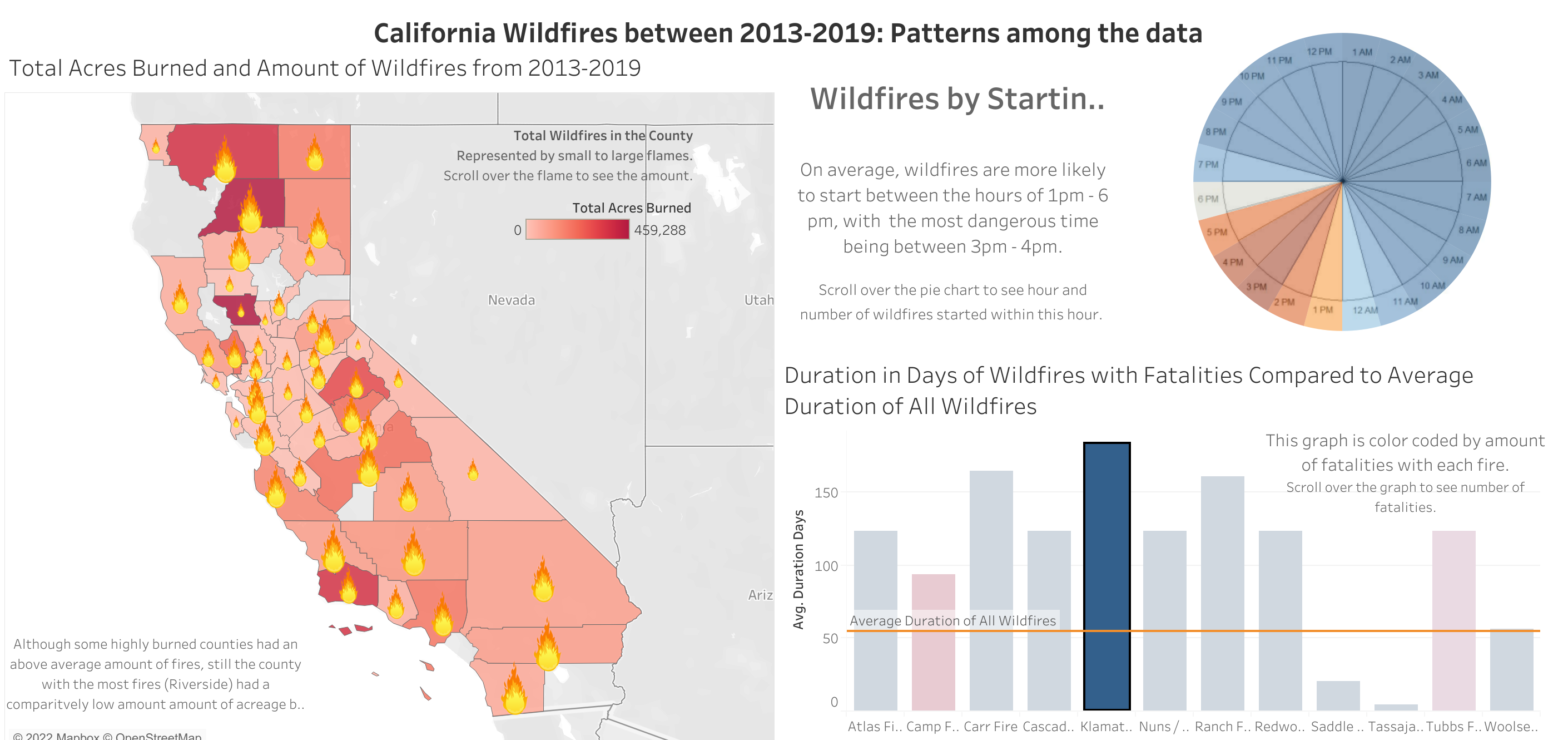 This project was my capstone project for the Google Data Analytics Professional Certfication course on Coursera. I was hoping to exmaine different patterns of wildfires within California in order to potentially find ways of preventing fires or decreasing duration of wildfires as we are unfortunately see the number of wildfires increase due to climate change. Wtihin the linked repository, you’ll find a markdown with a detailed explanation the process I took to complete this project along with examples and pictures from my SQL queries. After I completed the SQL analysis, I created a detailed Tableau dashboard that is interactive. At the end, I was able to find some interesting trends including most common times of wildfires and differences in wildfire patterns across counties in California, in addition to some points for further analysis.