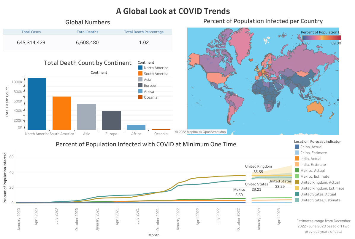 The purpose of this project was to examine trends and patterns across the globe in relation to the spread of COVID, deaths attributed to the illness, and vaccinations, as well. Within the linked resposity (above), you’ll find all relating files to the data analysis project, including raw data, cleaned data, and a markdown of SQL queries. In addition, an in-depth visualization was created using Tableau.