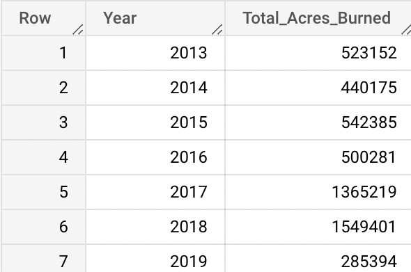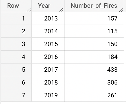 From this query, we can see already that years 2017 and 2018 had a significant increase in acreage burned per year, which brought up considerations as to why these years were so different. In order to understand more, another query was completed in order to understand if there was also an increase in total fires in these years, as well.