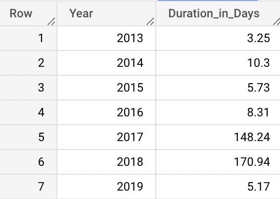 Next, some basic SQL analyses were preformed to get a better understanding of the general trends among the data. The BigQuery SQL server was used to preform these analyses. Below are some examples of these SQL queries along with their results.