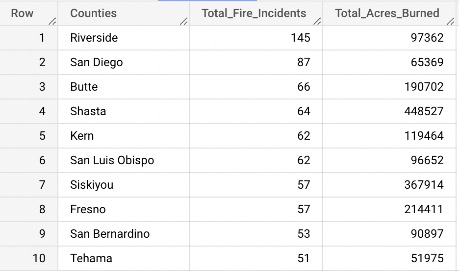 Following, deeper analysis was focused on the county level to see if these general trends also appeared within the counties. The next SQL query was preformed to see which counties had the most fires overall compared to acreage burned.