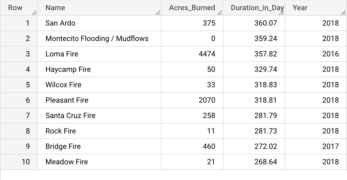 Within this table you can see that there was an overwhelming amount of these fires happening within in one year, 2018. To be specific, all but 2 of these fires. In addition, one of these fires that burned for almost a whole year, the Montecito Flooding/Mudflows fire burned a reported “0” acres. Much of these fires listed with the highest duration are much lower than the average wildfire of this list’s acreage burned being 3,241.60 acres. Which calls for further investigation into the validity of this dataset, in particular the measurement of time.