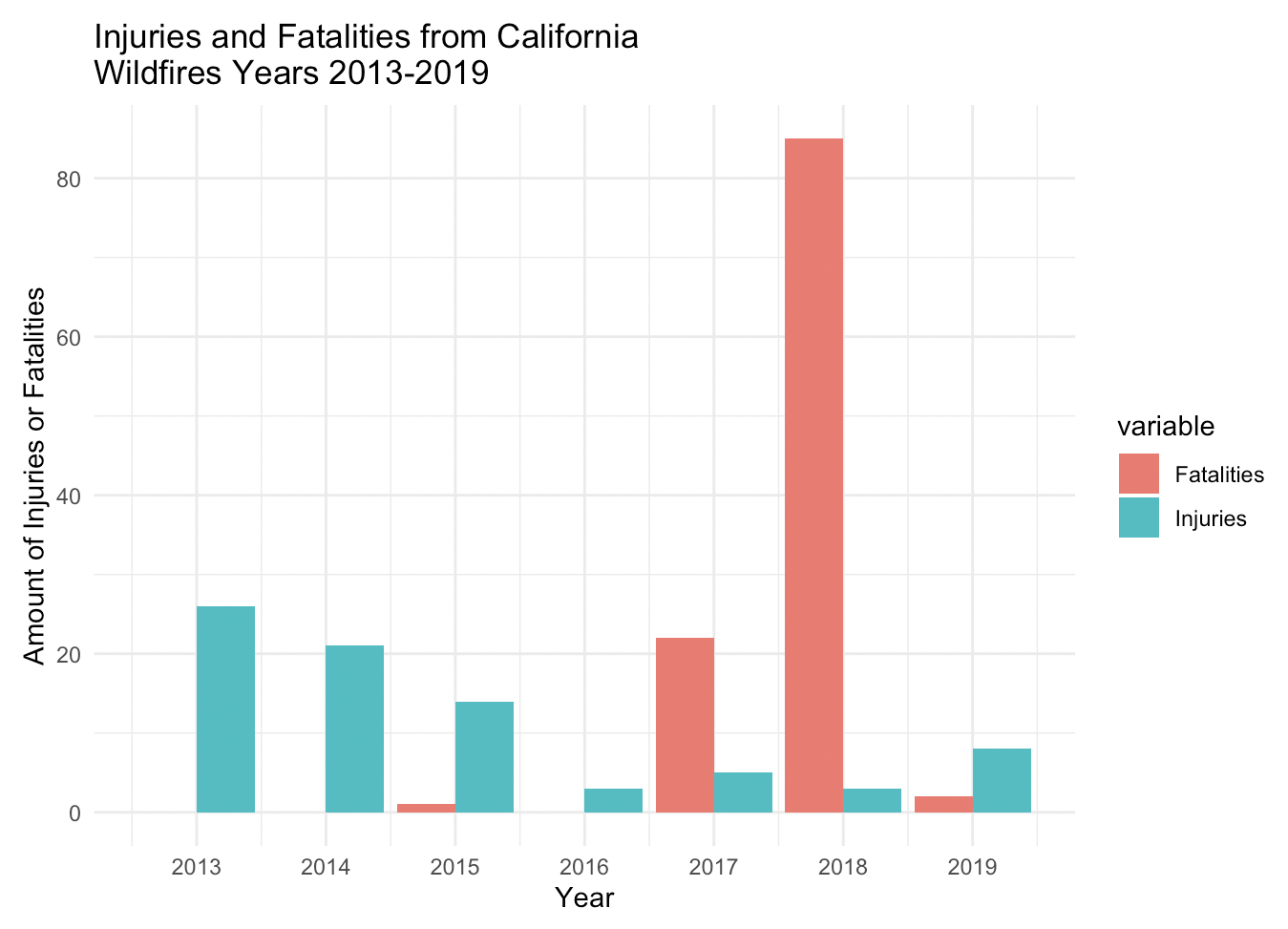 labs(title = "Injuries and Fatalities from California \nWildfires Years 2013-2019", x= "Year", y= "Amount of Injuries or Fatalities")+