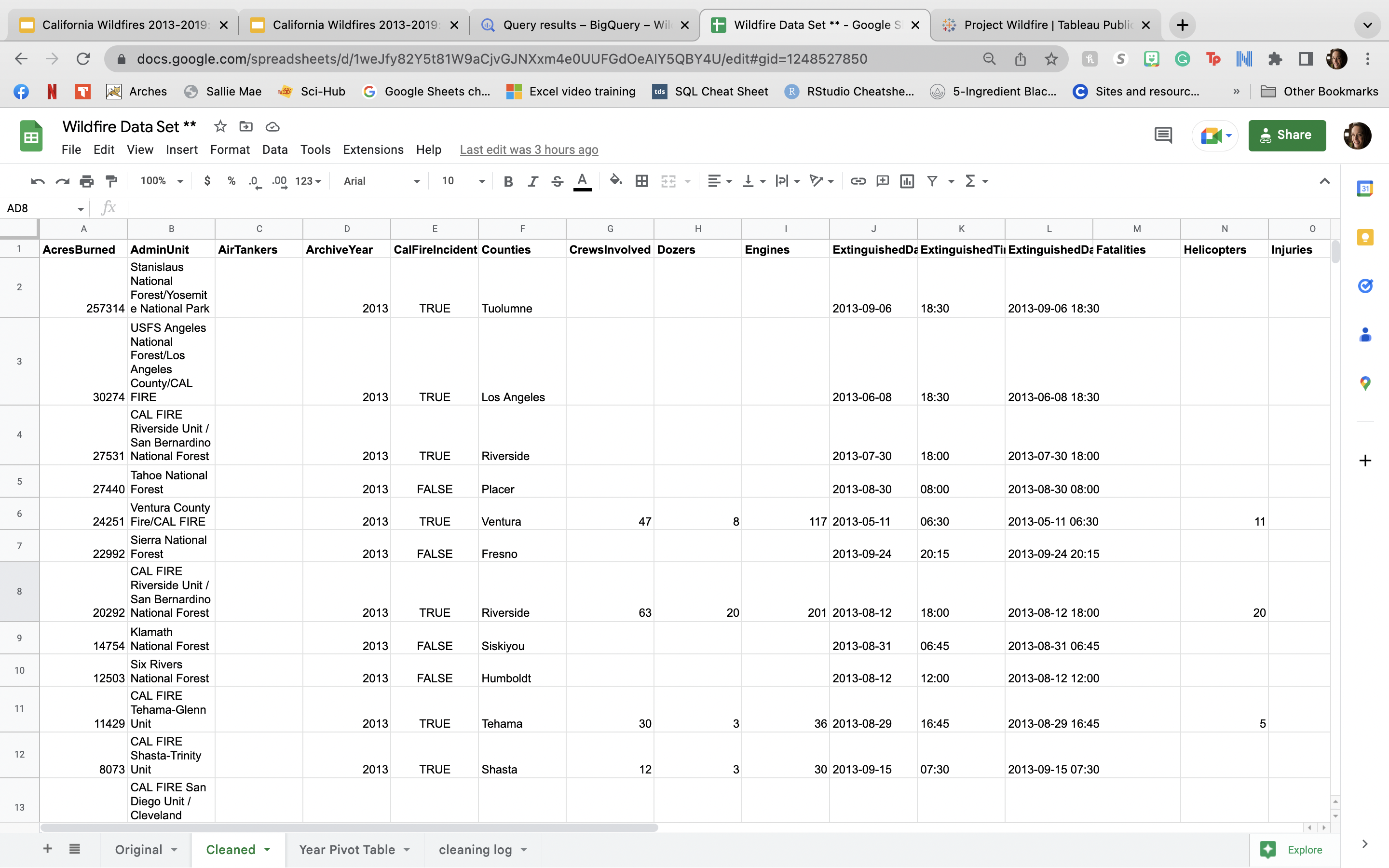 After sourcing the data (as mentioned above), the data was uploaded to Google Sheets for validation and cleaning purposes and titled Wildfire Data Set. In order to prevent disrupting the original data, a copy of the original data was made for safe keeping and validation. After, a cleaning log was created to document the steps taken for cleaning.
