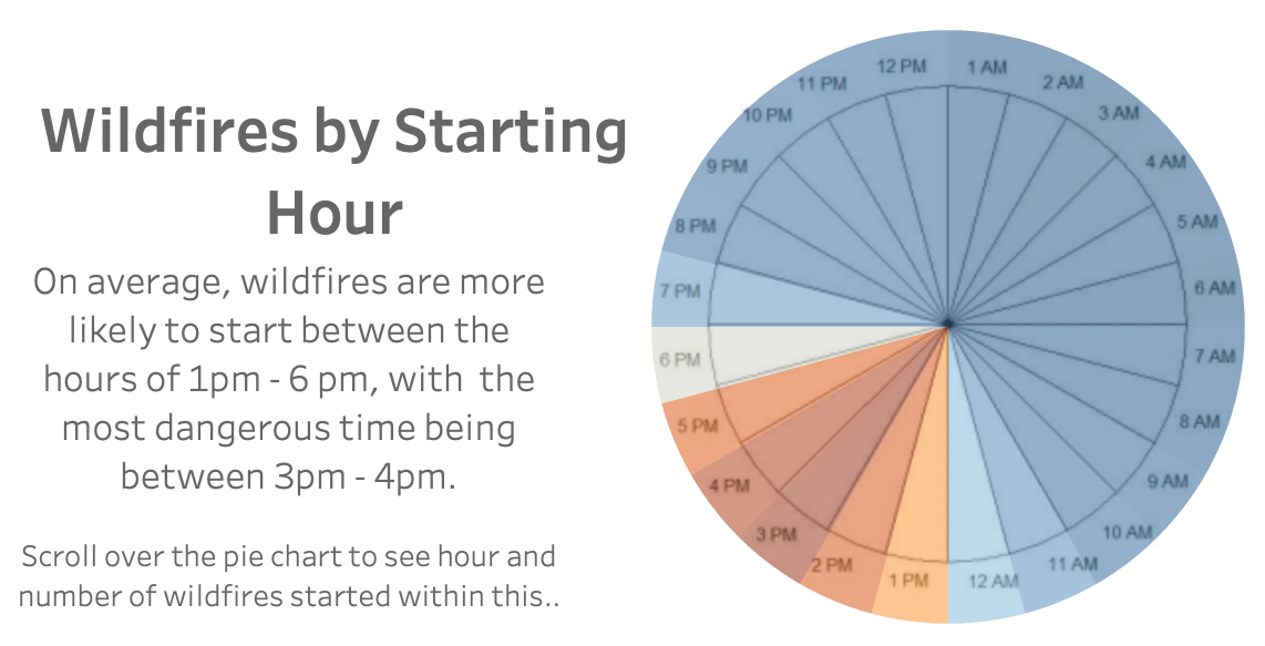 The graph below was created to demonstrate the most common starting times for all wildfires documented in this data set. Again this graph is best experienced in the Tableau dashboard where you can scroll over the graph to see it’s labels and features. Below is only a screenshot. The blue represents less wildfires starting within this hour while the dark orange indicates the most amount of wildfires starting in this hour and the white falls in between.