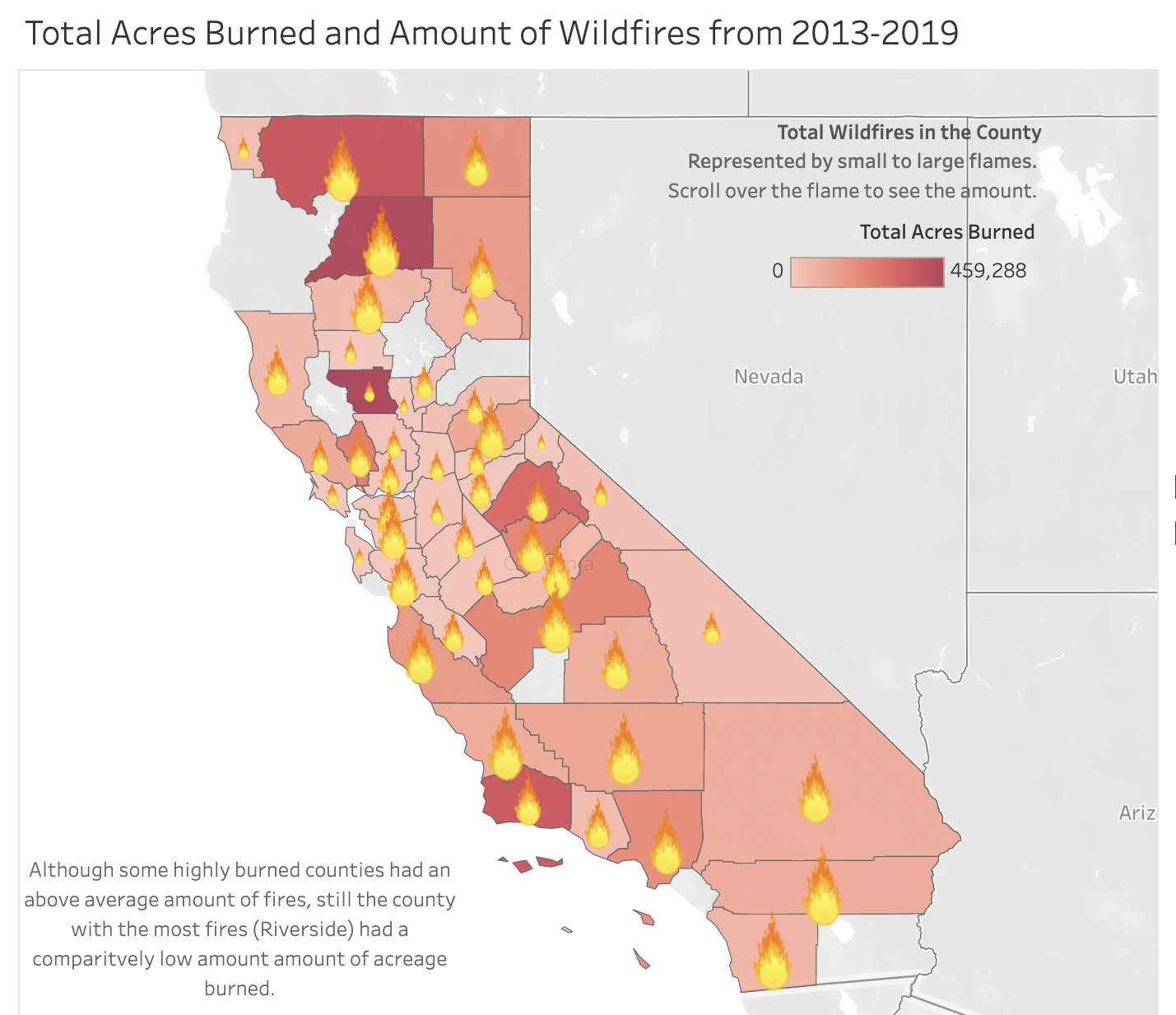 One interesting theme appearing among the data was the counties with the highest acreage burned were not the counties that had the most fires, as noted previously when completing SQL analysis. The following map graph displays this interesting phenonmenon, but is best experienced at the Tableau dashboard, below is only a screenshot.