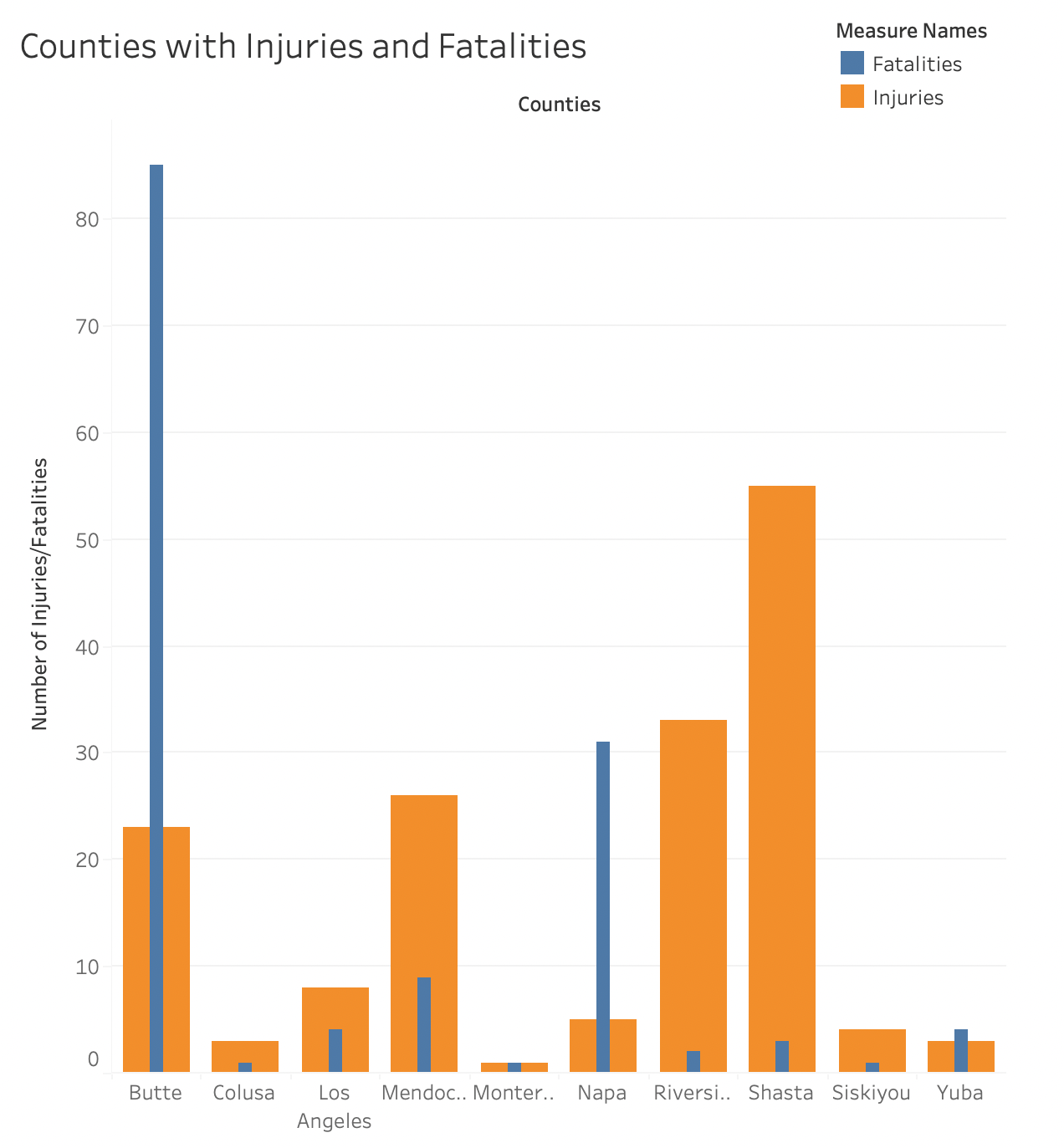Lastly, the chart below was developed to show the counties that had injuries and fatalities, in order to understand which counties are plauged with the dedliest fires. This information could be used to look further into the steps taken by the public administration, including extinguishng teams, fire departments, and police efforts to see if there could be improvements compared to other counties, which could be a useful place for further analysis including response time and attempts to inform, warn, and evacuate the public. Of course, there are numerous factos as to why these counties experienced the highest number of injuries and fatalities, but furhter research could be useful to help prevent any further injuries or fatalities.